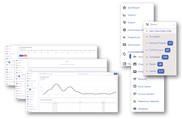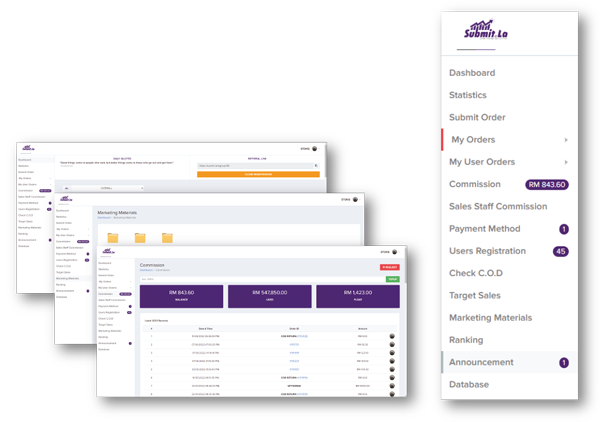 Sistem automasi lengkap untuk pemilik perniagaan menguruskan ejen, data pelanggan, tempahan, komisen ejen, pengurusan stok, dan notifikasi tempahan terus ke dalam WhatsApp hanya di dalam 1 sistem
